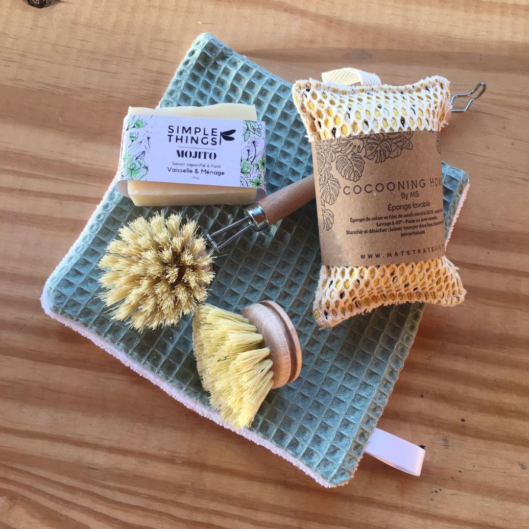 Une éponge lavable, par exemple, peut durer plus d'un an, évitant ainsi le rejet de plusieurs éponges jetables dans la nature. La brosse en fibres naturelles est également conçue pour être durable et son manche est renouvelable, ce qui réduit l’usage de plastique. Avec le savon vaisselle solide, on élimine aussi les emballages plastiques associés au liquide vaisselle classique, tout en réduisant l’impact des substances chimiques sur les cours d’eau.